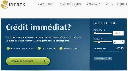 AS Finanz GmbH se place donc comme interlocuteur unique pour vos problèmes d’argent et vous apporte son aide et ses conseils dans la démarche de trouver une assurance moins chère qui correspond à vos attentes. Toutes vos questions financement sont prises en compte et votre budget est optimisé. En ligne, il est aussi possible facilement de faire une demande de crédit. Pour cela, il est indispensable d’indiquer le montant par exemple 10000 pour un prêt de 10000 CHF. En indiquant le nombre de remboursement, vous obtiendrez le montant des mensualités.