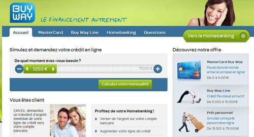 Buyway est un organisme de crédit belge qui propose des moyens de paiement, des cartes prépayés, des prêts personnels et des crédits flexibles. Équivalent à la filiale Cetelem Belgique, ce spécialiste du prêt entend répondre aux besoins des particuliers. Sous le nom Buy Way Personal Finance, la société de droit belge est maintenant détenue majoritairement par un holding, un groupement européen d’intérêt économique GEIE. Initialement créé suite aux demandes de crédit auto, Buyway a su se diversifier pour proposer maintenant une carte mastercard mais aussi des cartes prépayés, des prêts personnalisables et aussi des assurances. Avec le service Homebanking vous bénéficiez d’accès en ligne à vos comptes à distance. Cela vous permettra de consolider votre solde, d’effectuer des versements en ligne mais aussi d’augmenter votre réserve d’argent si besoin.