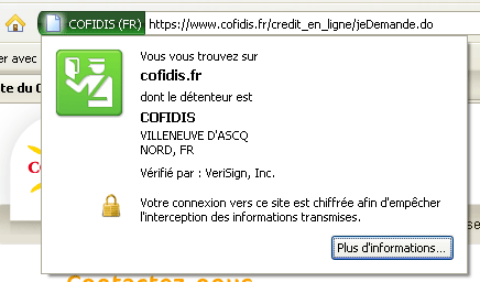 Cofidis est membre actif du conseil de protection des sites internet. Il vous propose une connexion certifié « https » sécurisée et cryptée. Il est conseillé de vérifier avant d’échanger toute information sur le web que la connexion est bien dans le protocole « https » comme montrée sur l’illustration qui suit. De plus, le phishing étant de plus en plus important sur internet, nous vous mettons en alerte lorsque vous êtes redirigé vers des pages dont la syntaxe n’est pas « https://www.cofidis.fr ».