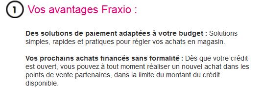 Les avantages du paiement Fraxio sont assez simples. Tout d’abord, suivant votre besoin, le conseiller crédit estimera une réserve d’argent qui vous sera créditée. Cette solution simple, vous permet de régler vos achats en magasin sans avoir à attendre un accord de principe et de longue démarche administrative. Le prêt à la consommation est donc totalement personnalisé. Autre avantage dans le temps, une fois le premier accord obtenu, vous profitez des prochains achats financés sans formalités. Inutile à chaque dépense de faire une demande, le compte crédit reste ouvert et le remboursement se fait périodiquement. Si vous souhaitez ré-utiliser la réserve d’argent avant de l’avoir remboursé en intégralité, c’est tout à fait possible.