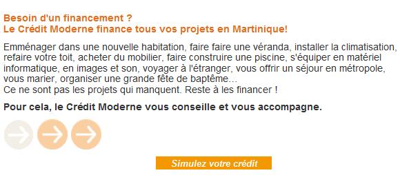 Au même titre que Crédit Moderne Guyane ou Crédit Moderne Guadeloupe, l’ile de la Martinique a elle aussi sa filiale spécialisée, Crédit Moderne Martinique. Créé en 1991 afin de financer les achats de voitures dans les concessions, l’entreprise a élargi son offre afin de toucher une plus large clientèle. Rattaché quelques années après sa création au groupe BNP Paribas, l’organisme de prêt compte bien utiliser la forte implantation de sa maison mère pour imposer son offre à large échelle. Crédit Moderne est maintenant le numéro 1 en ce qui concerne le crédit à la consommation sur les territoires français d’outre-mer donc de Martinique. Ses produits et services sont divers notamment les prêts projets, le crédit à la consommation mais aussi des assurances. En ligne, sur Crédit Moderne.com, un espace client permet de suivre vos demandes et vos crédits. Ainsi vous pouvez consulter la réserve d’argent disponible qui vous est destinée, faire une demande express pour un financement rapide et suivre vos demandes de prêts en ligne via votre numéro de dossier.