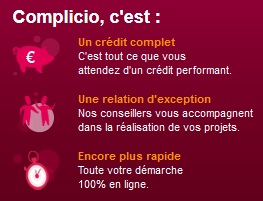 Complicio est une filiale de Monabanq France et commercialise des crédits en ligne. Ce qui le distingue de ses concurrents est le fait que Complicio ne propose pas l’opération financière de rachat de crédit. Pour son image, Complicio a donc fait un choix responsable et stratégique. Dans l’optique de faciliter la vie de ses collaborateurs et de ses clients, Complicio offre le service Mon Compte ou Espace Client. Vous pouvez aussi contacter Complicio directement en ligne ou laissez vos questions. Les conseillers téléphoniques Complicio sont disponibles 6 jours sur 7 pour répondre à vos questions et vous conseillez quelques soit votre projet. Mon Compte Complicio c’est l’assurance de la transparence tout au long de votre crédit.