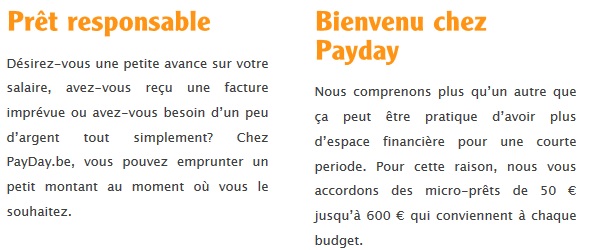 Pourquoi choisir le microcrédit PayDay Belgique ? L’organisme de prêt est encadré par les réformes en matière de crédit et ne vous facturera au maximum que 4 euros par crédit comme le démontre le tableau des emprunts. Ensuite, après avoir fait une première demande de crédit en ligne, vous pouvez procéder aux suivantes directement par SMS. De plus le service client PayDay est sérieux et reconnu. Il répond à vos questions et vous assiste tout les jours sauf le dimanche. Pour cela, contactez les par téléphone au 02 – 808 46 70 ou 0 842.944.252 entre 8 heure et 22 heure. Par mail, vous pouvez aussi joindre l’organisme en écrivant à info@payday.be ou en remplissant le formulaire en ligne.